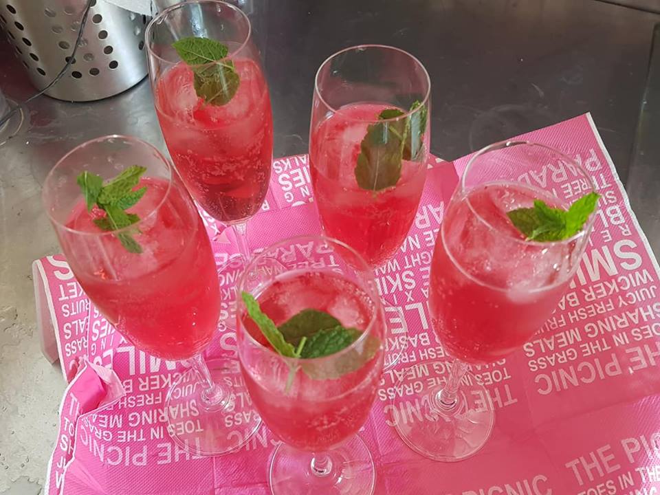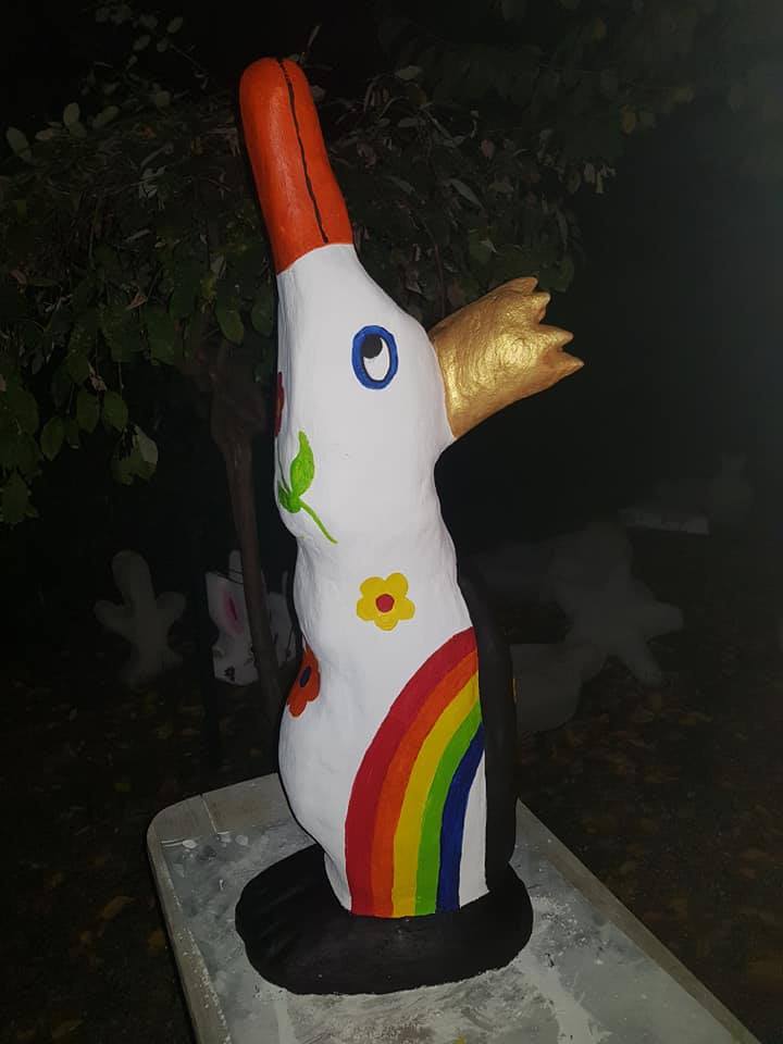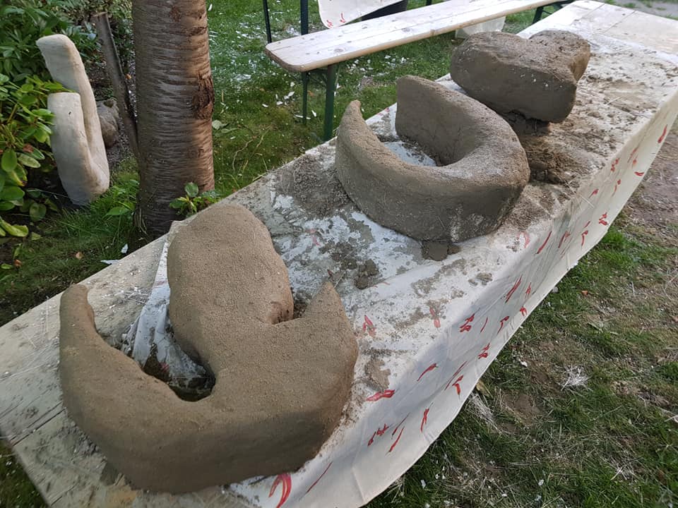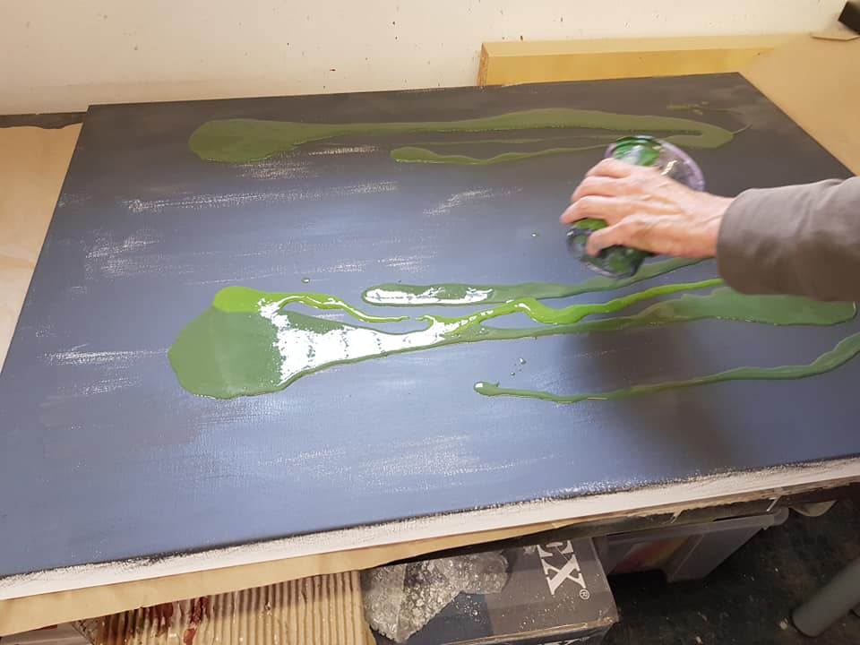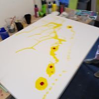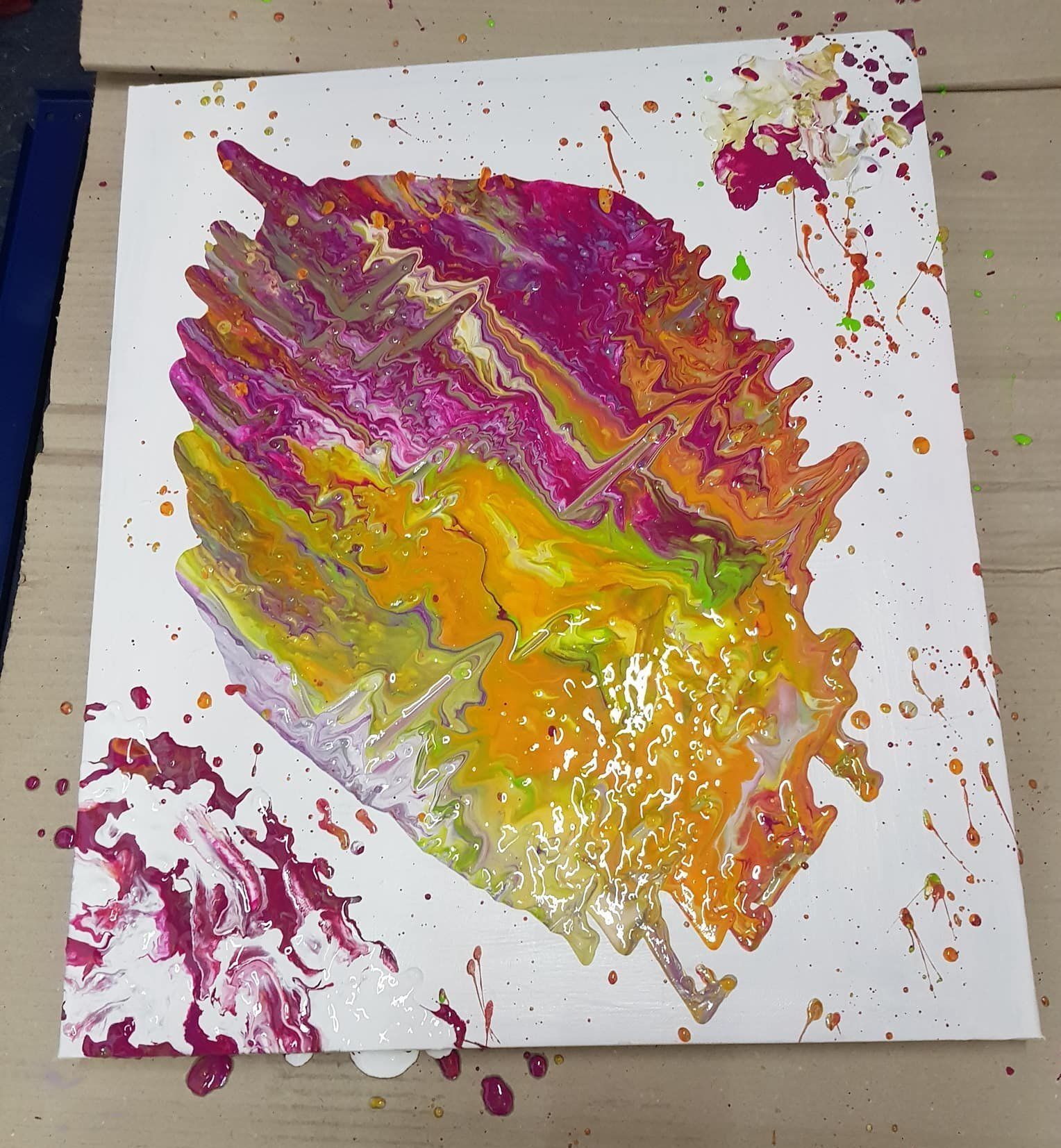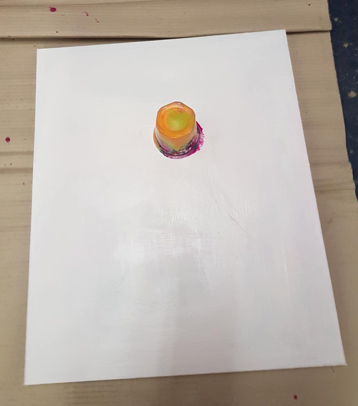 Abwechselnd die Farben oben in den abgeschnittenen Becher gießen und diesen über die Leinwand wandern lassen.